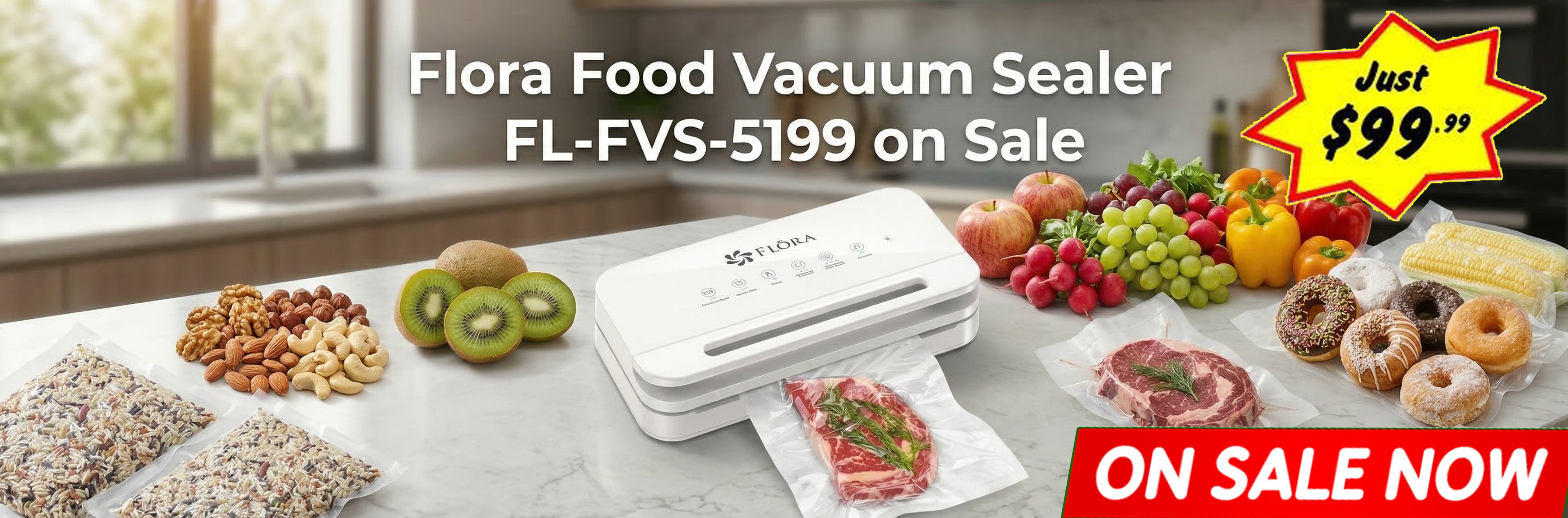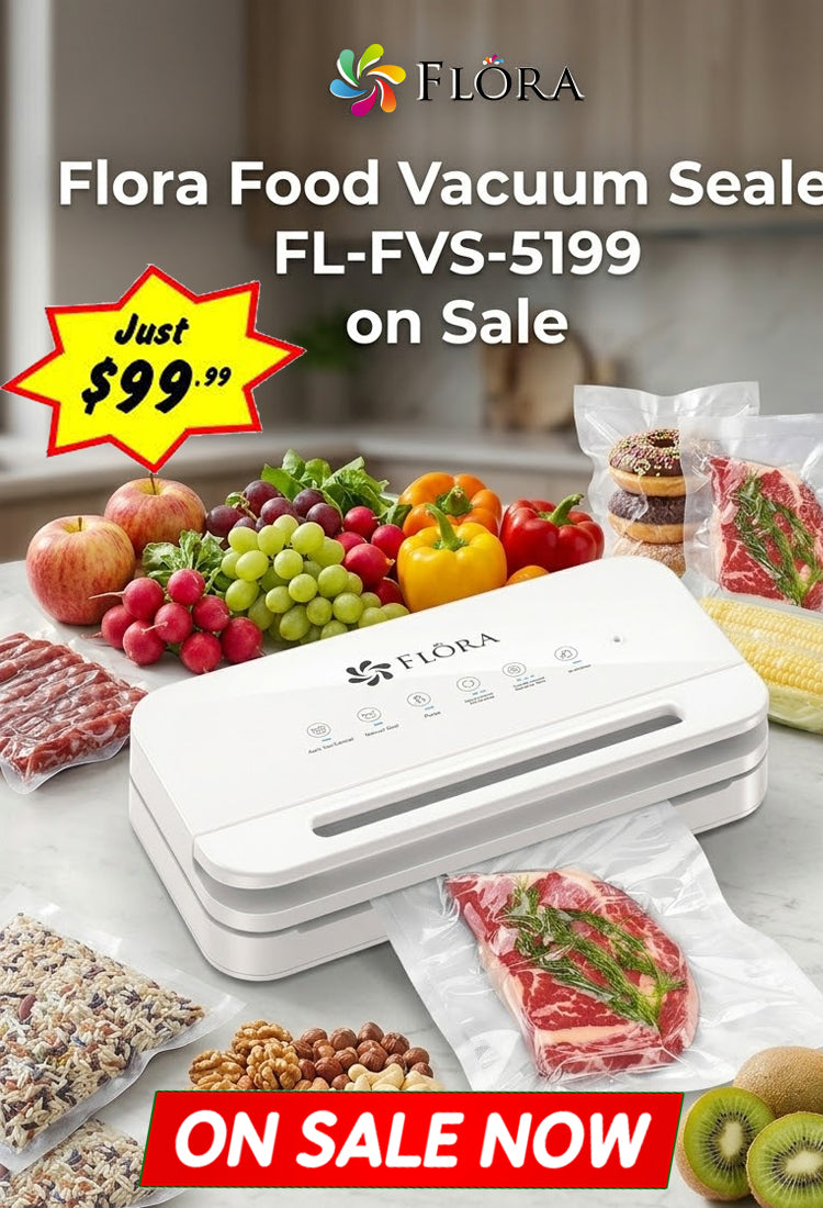 Flora Food Vacuum Sealer Machine-FL-FVS-5199,3-in-1 Dry/Moist/Canister | Pulse Control & Locking Handle System, BPA-Free Precision Sealing with Compact Storage Design for Meat, Meal Prep, Sous Vide